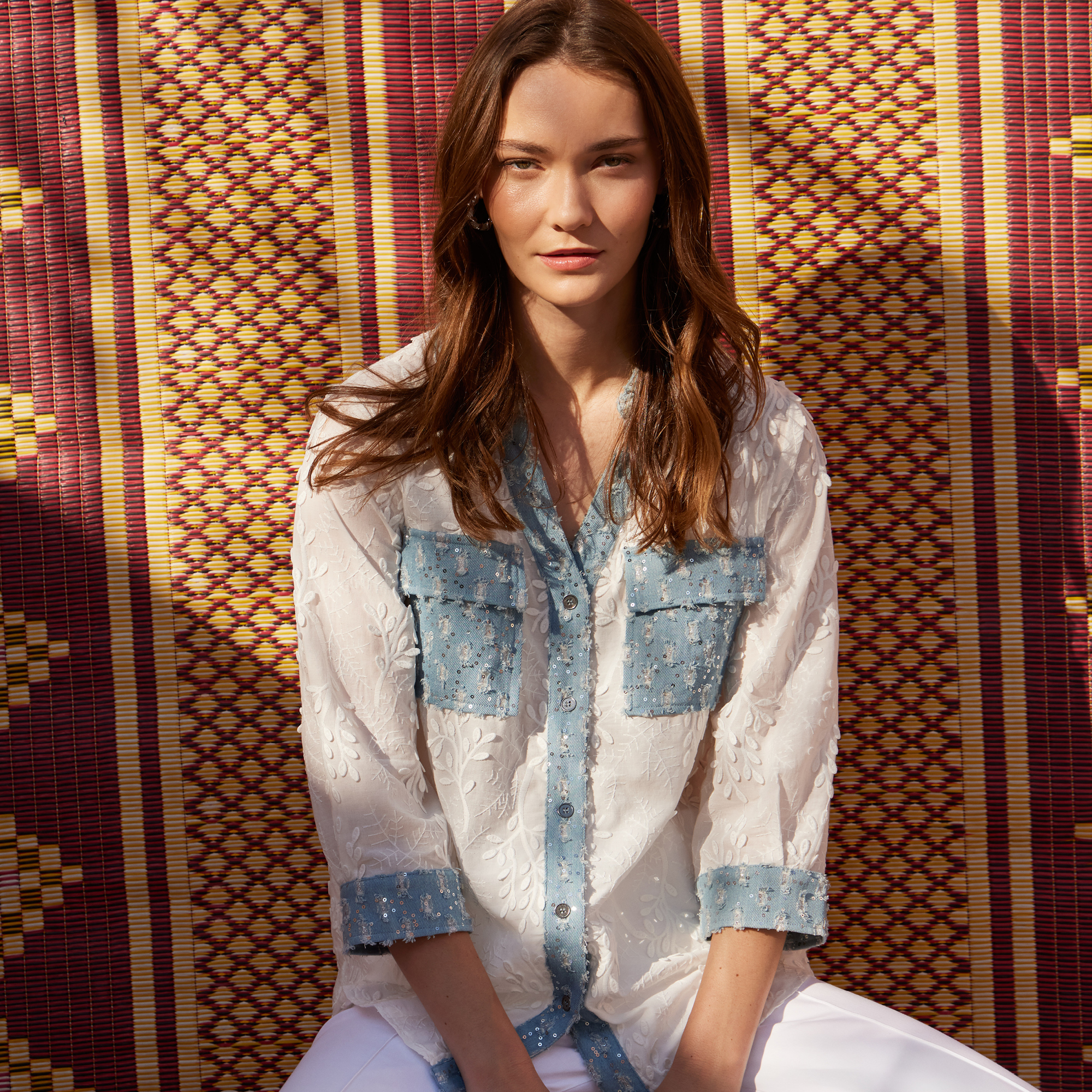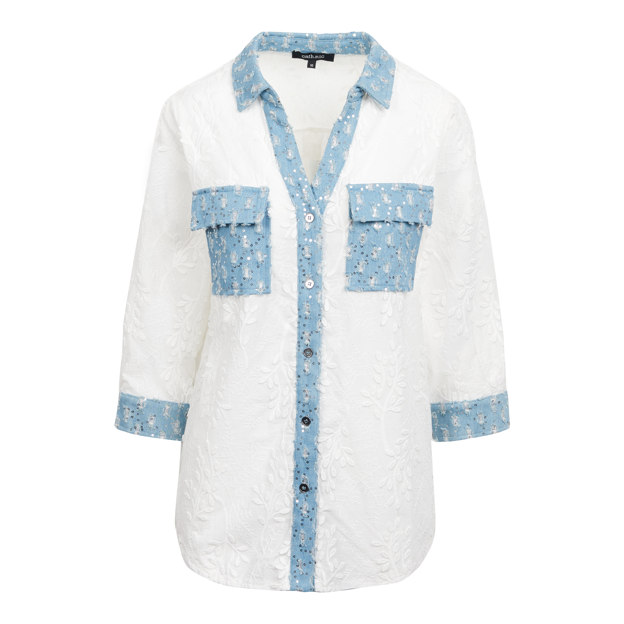 Embroidered Sequin Denim Combo Woven Shirt