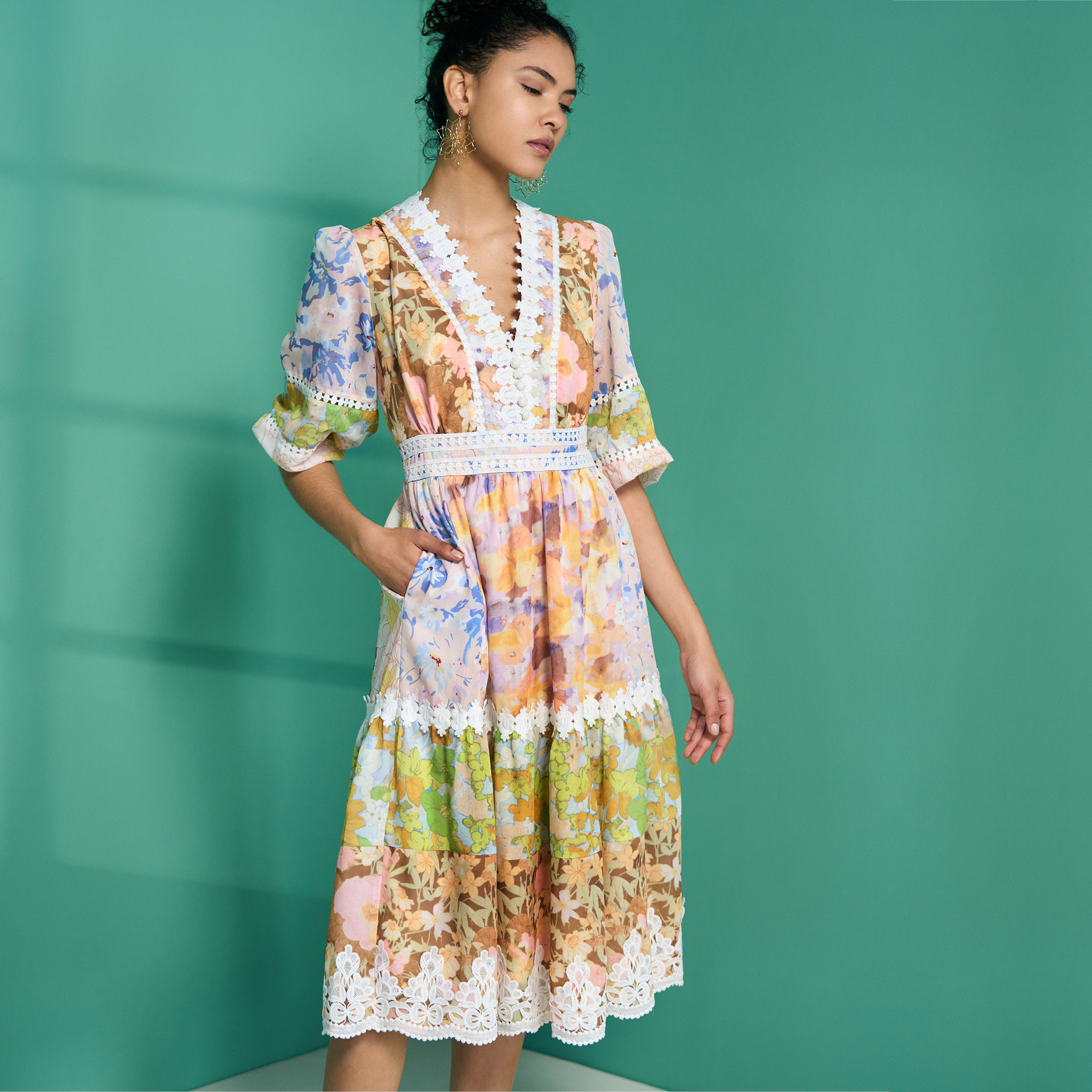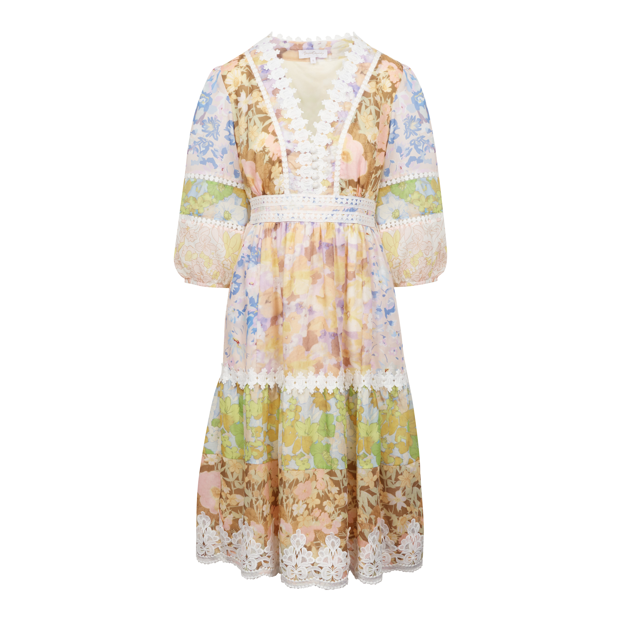 Multi Floral Printed Lace Trim Woven Dress quantity