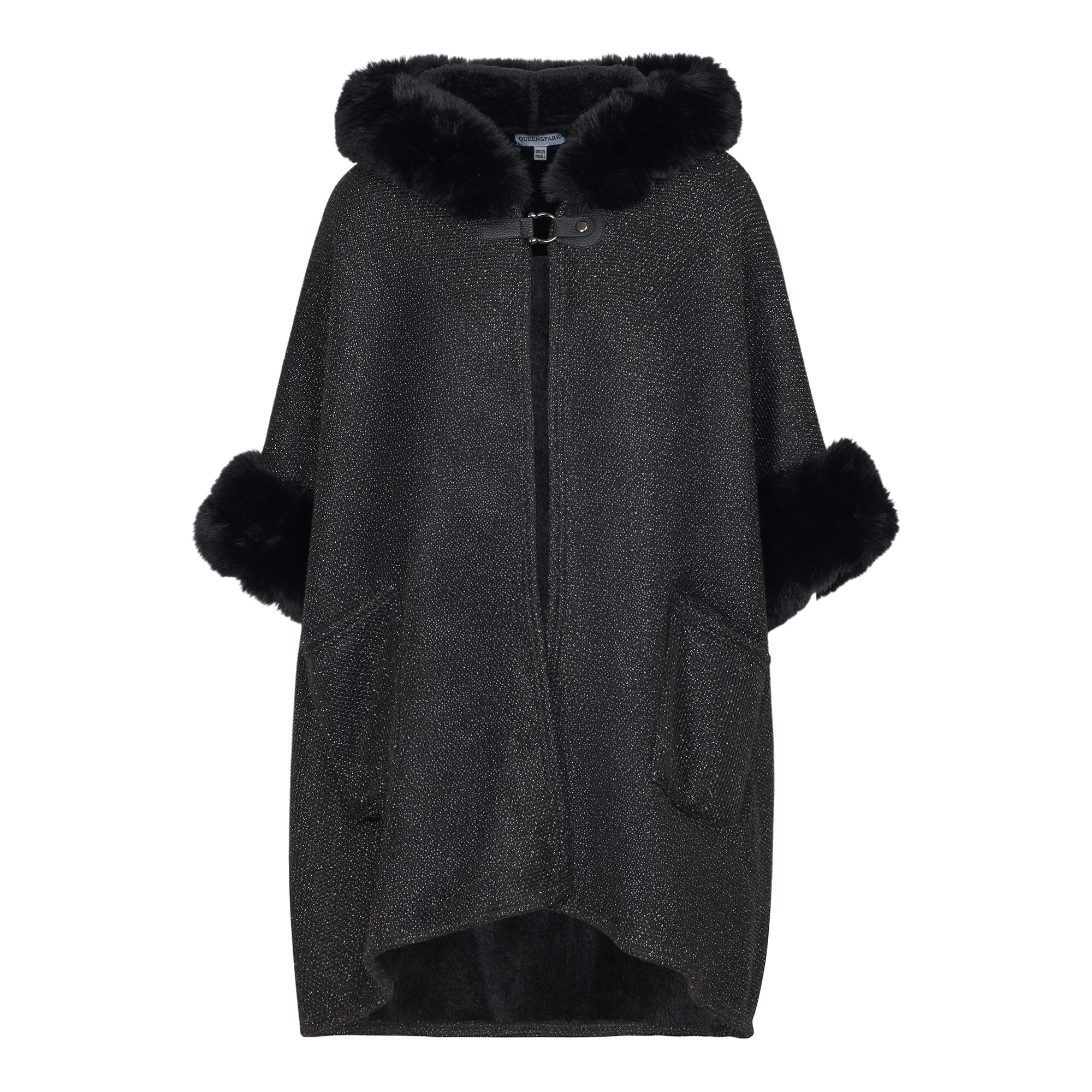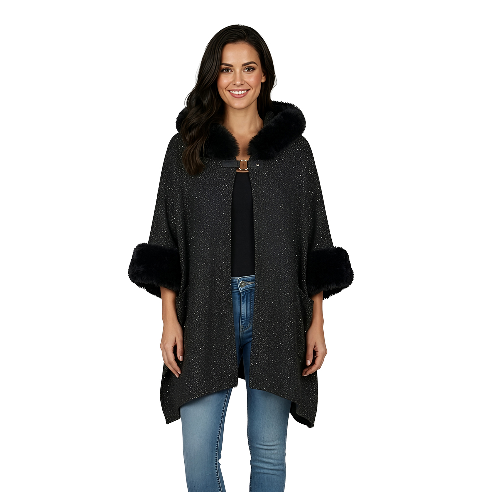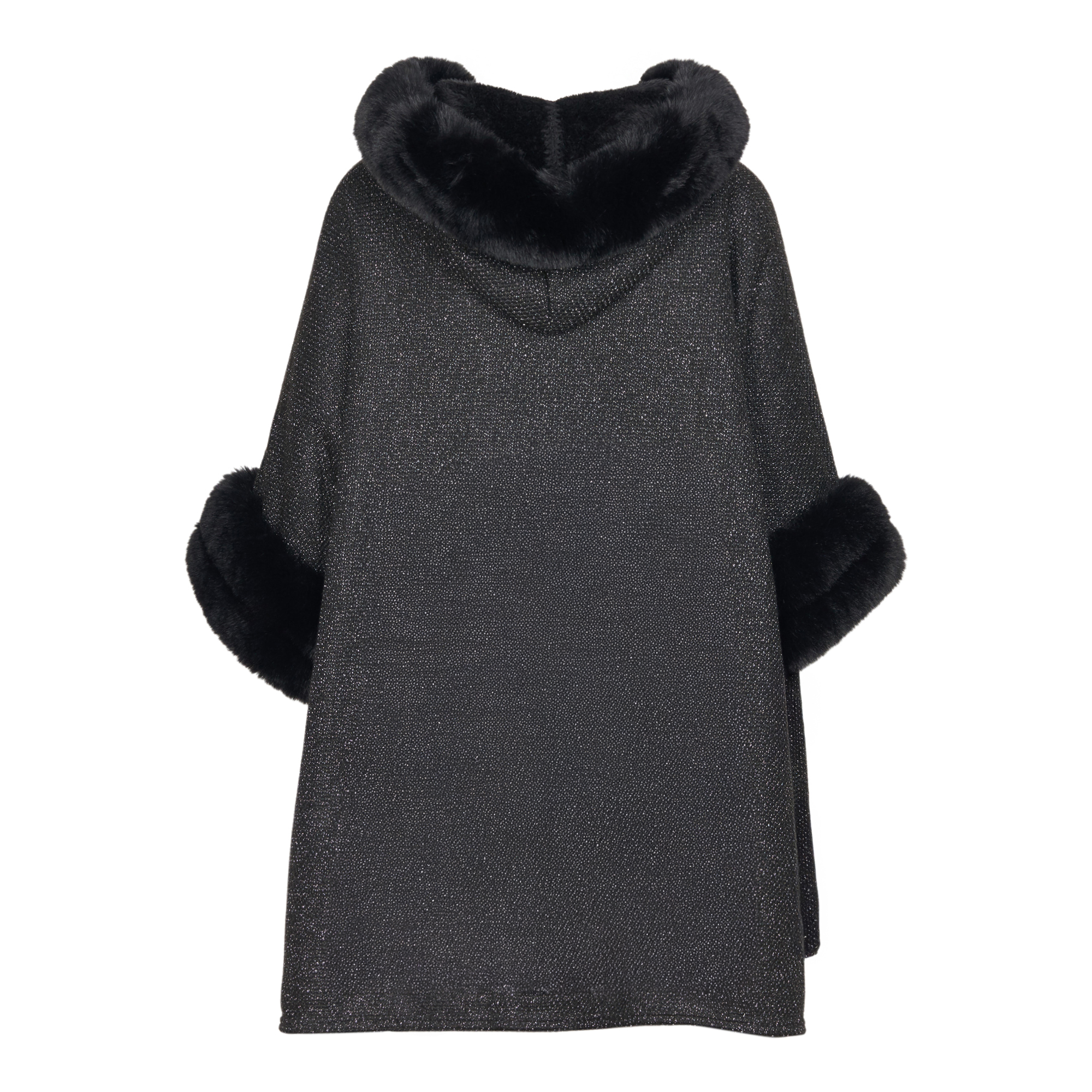 Lds Knitted Glitter Hooded Faux Fur Cape